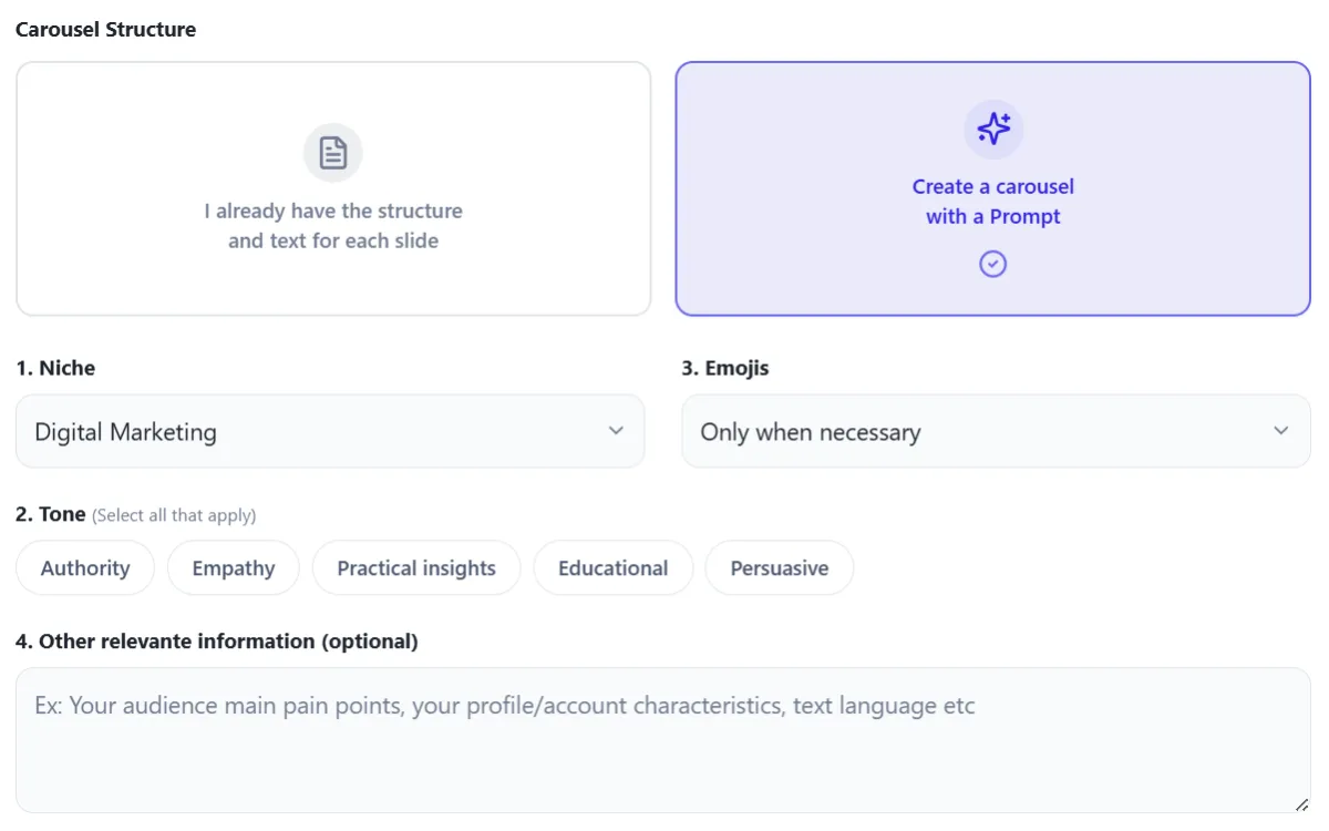 Você tem 10 créditos para pode criar e exportar seus primeiros carrosséis gratuitamente, com todas as funcionalidades, incluindo a IA.